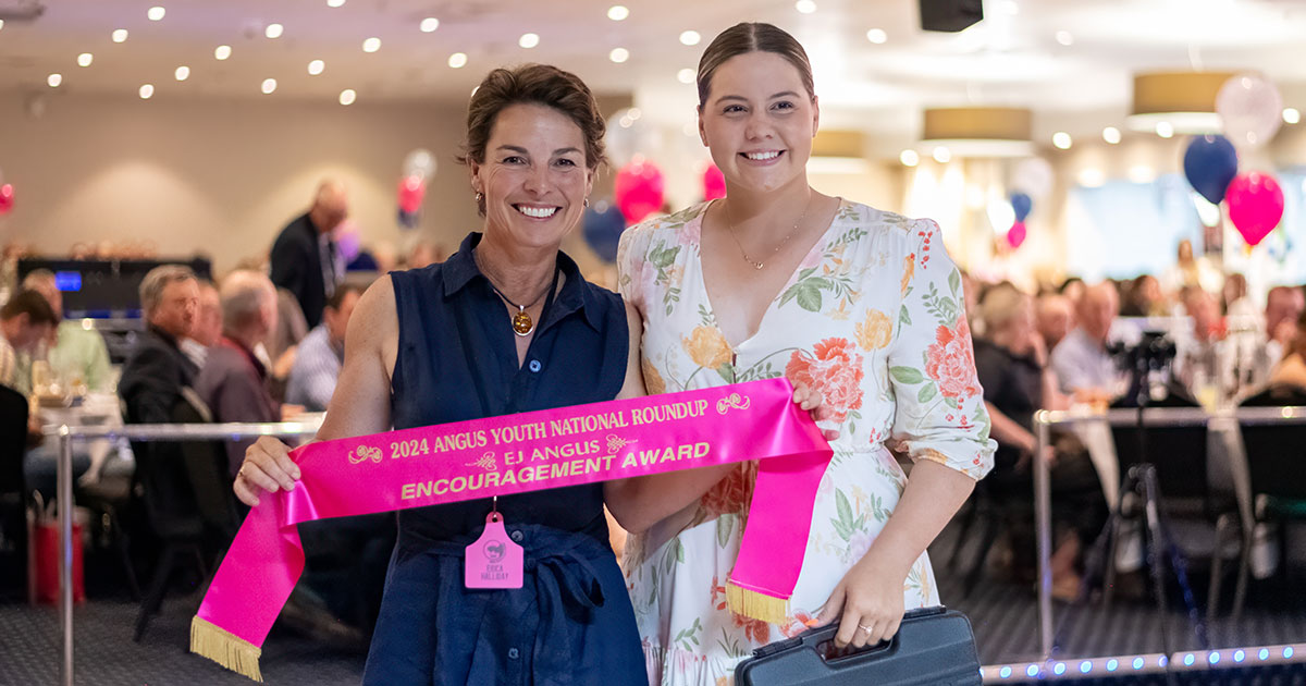 At the 2024 NH Foods Angus Youth Roundup, Angus Australia President and principal of Ben Nevis Angus, NSW, Erica Halliday was tasked by the Grylls Family to select and award the EJ Angus Encouragement Award to this year’s recipient, Brianna O’Donnell.