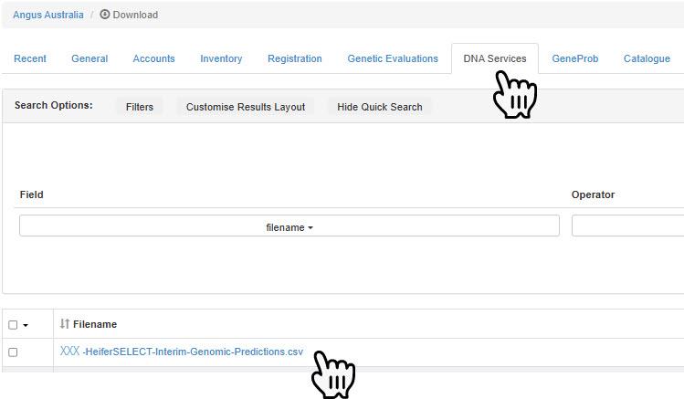Select the “DNA Services” Tab and locate the file. This file is currently named: “XXX-HeiferSELECT-interim-genomic-predictions.csv”