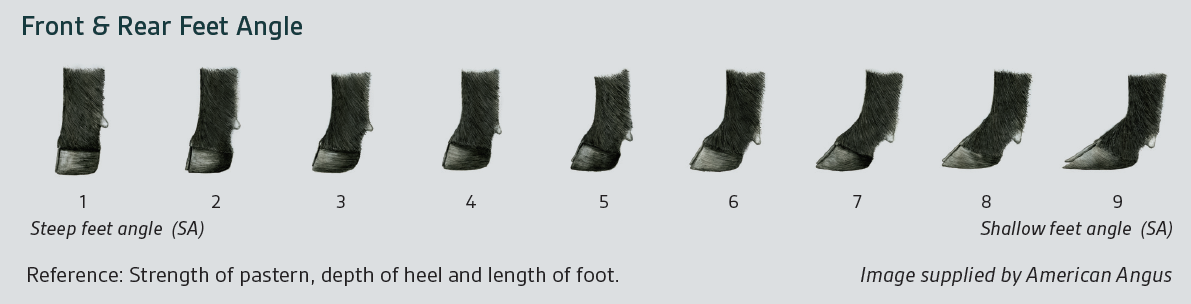 Mature cow feet and leg scores assess the structural soundness of the feet and legs in mature females, and are measured as visual scores.