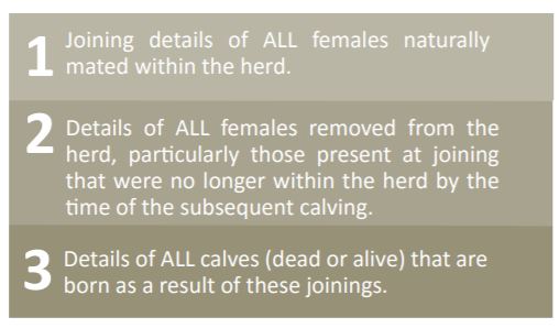 For each natural joining event within the breeding season, record the bull the female was joined to, the date she was joined (‘bull in’ date) and the date the bull was removed (‘bull out’ date). Knowing the end of the joining period is important in analysing the Days to Calving trait.