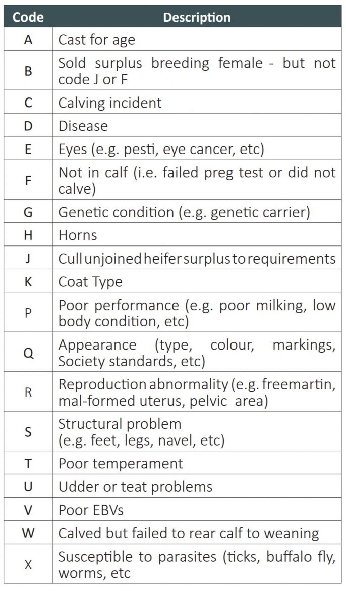 The fate/disposal code information is critical to the Days to Calving analysis and is used to determine whether females that have a joining record but no subsequent calf should be penalised for being “culled for infertility” or not penalised because they were culled for other reasons e.g. structure, performance etc. In the future, this information may also be used as part of the calculation of a Female Longevity EBV.