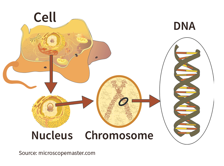 An animal is made of cells, inside each cell is a nucleus, within the cell nucleus are pairs of chromosomes, chromosomes are bundles of DNA.