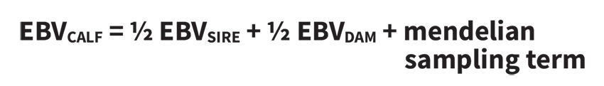 In their simplicist form, the breeding value calculated for an animal can be thought of as one half of the sire’s breeding value, plus one half of the dam’s breeding value, plus the mendelian sampling term. The mendelian sampling term represents the animal’s difference from the average of its parents’ breeding values and is due to the random sample of genes and chromosomes that the calf inherited.