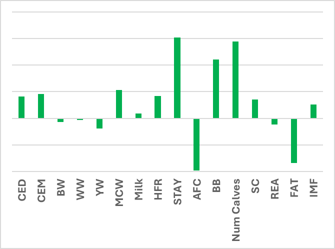 The selection advantage of using each index is displayed below. The selection advantage is indicative of the relative response that will occur in individual traits if selection is based on each index. The actual response that is observed will vary depending on the features of the individual breeding program. It is calculated by ranking 2022 born sires within the UltraSELECT evaluation, and comparing the average EBVs of the highest 10% with the average EBVs of all 2022 born sires from which they were selected.