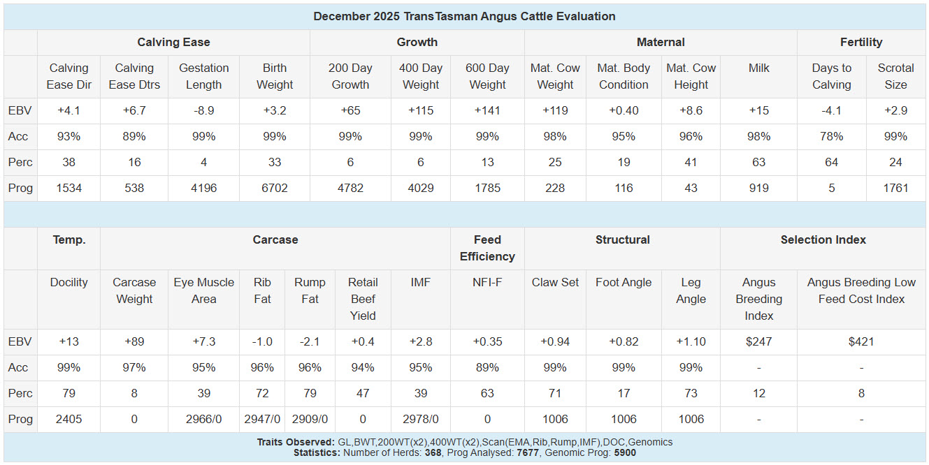 Using the percentile to compare each EBV against the breed average allows you to quickly identify exactly where an animal ranks within the population for each trait. Click Here to view the most current version of the TransTasman Angus Cattle Evaluation EBV Reference Table.