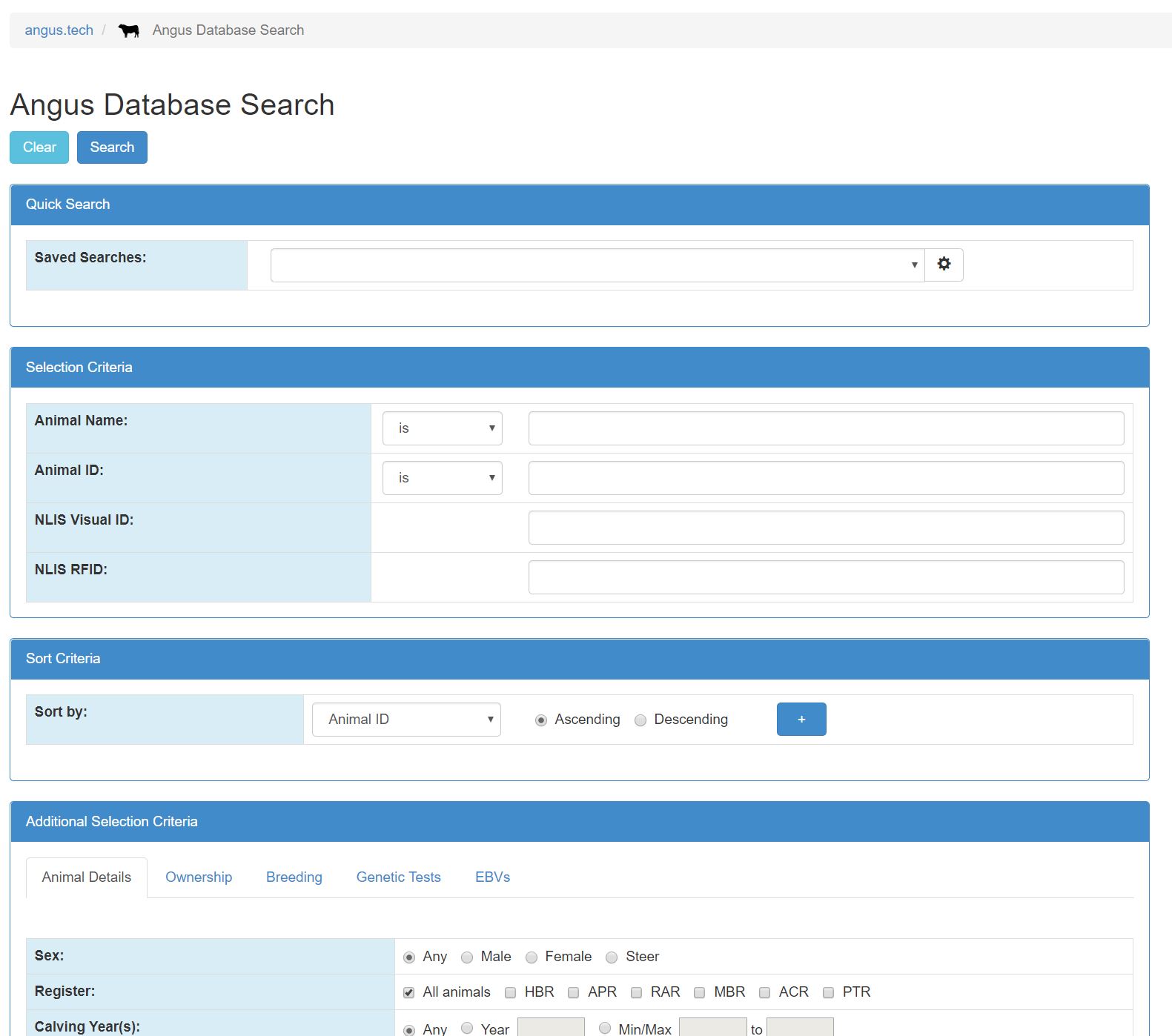 1. Once you have signed in as a registered user and selected ‘Angus Database Search‘ at the top of the page, scroll down the page to the ‘Additional Selection Criteria’ .