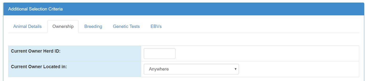2. The criteria you can enter are displayed under 5 tabs; Animal details, Ownership, Breeding, Genetic Tests and EBVs. Click on the relevant tab to bring up the additional selection criteria to select from (as an example to search for the top 1% of bulls for ABI in Northern NSW).