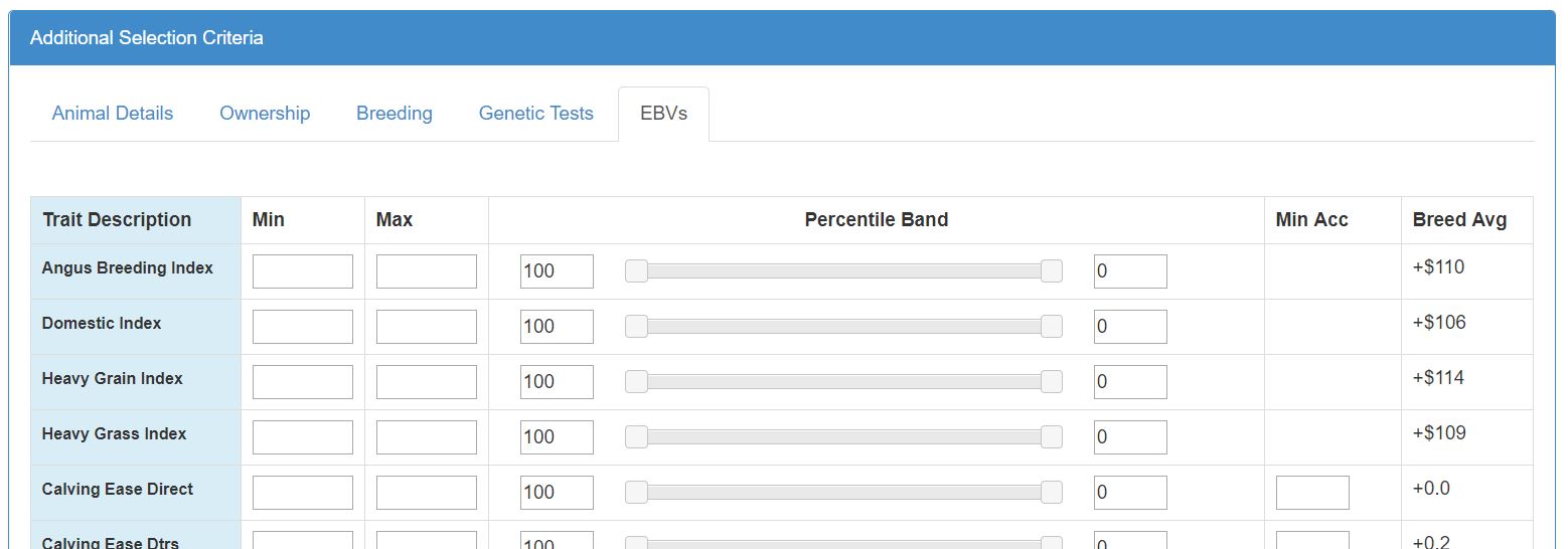 5. Click on to the EBVs tab, and for Australian Breeding Index (ABI) you can either put in the minimum breeding value for the 1% or alternatively type ‘1‘ in the box to the left of the slide bar for ABI.