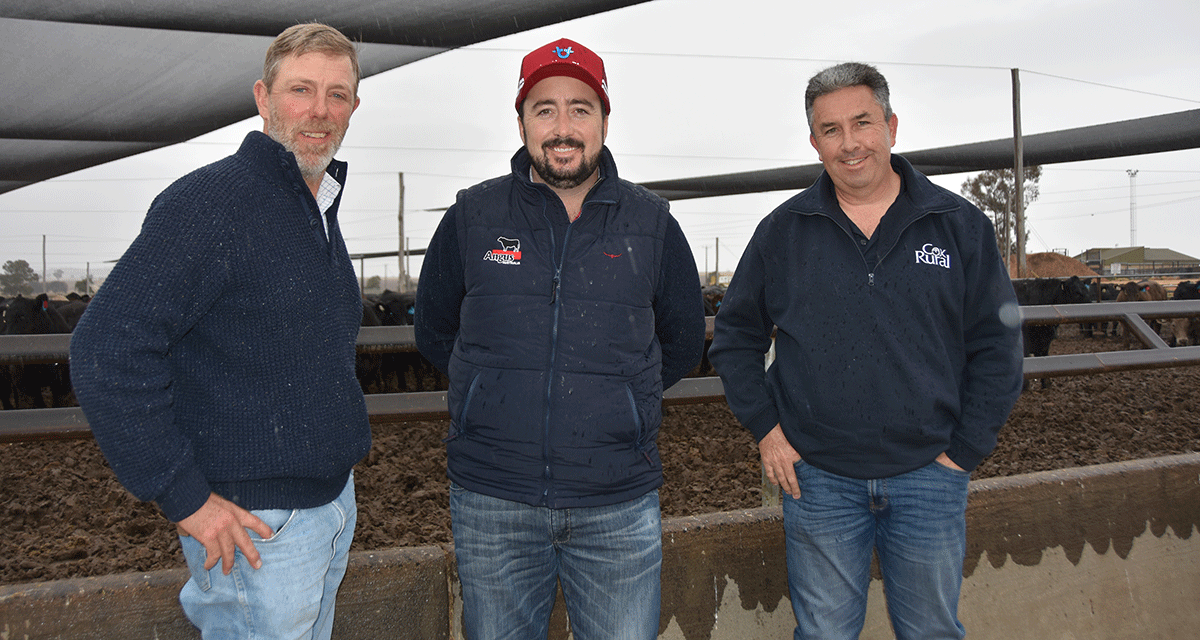 Feature Image: SGCC chairman Ben Glatz and committee member Jake Phillips with one of the sponsors Damian Buckley, Cox Rural, inspect the 2021 entries at Teys Charlton feedlot in May.
