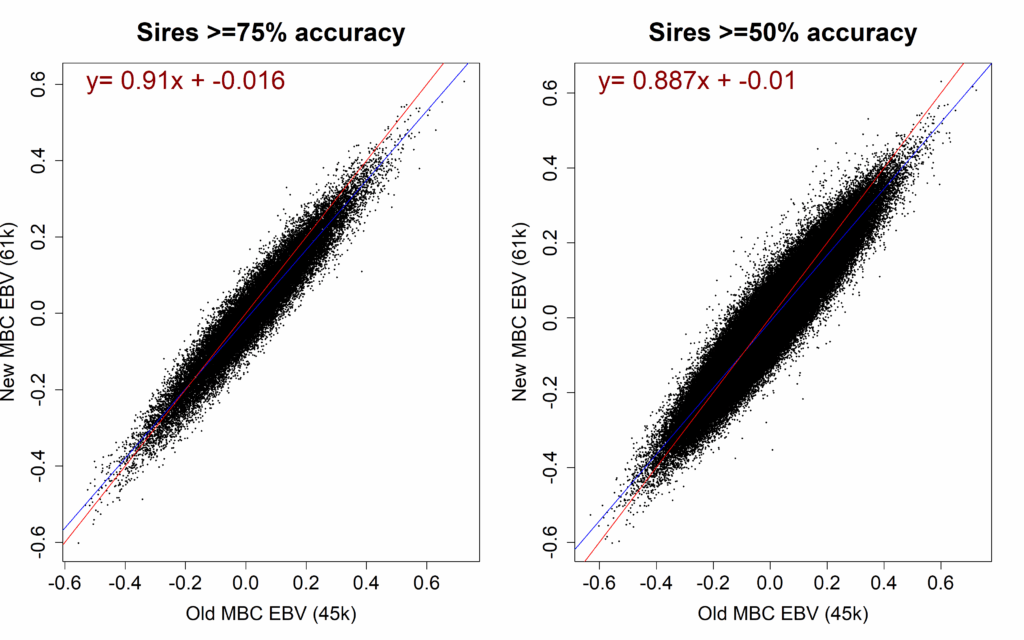 The figures compare the previous MBC & MCH EBVs (based on 45k SNPs) with the updated MBC & MCH EBVs (based on 61k SNPs) for both sires with higher (≥75%) and moderate (≥50%) accuracy. The comparison demonstrates a strong correlation between the previous and updated MBC & MCH EBVs (>0.95), with regression slopes close to 1 and minimal changes to the intercepts. Correlations between the previous and updated CT EBVs were also high (>0.98) for both sires with higher (≥75%) and moderate (≥50%) accuracy. This indicates that the relative ranking of animals has remained largely unchanged.