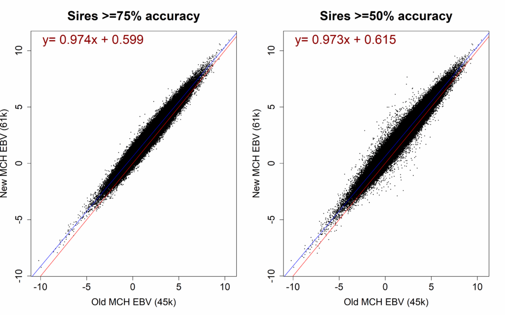 Figure 1. Scatter plot comparing EBVs pre- vs post-enhancement for MBC and MCH traits, highlighting high correlation (>0.95) and minimal re-ranking for both high (>75%) and moderate (>50%) accuracy sires.