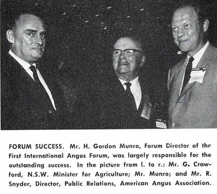 In 1969, the Society celebrated its Golden Jubilee and celebrated the registration of its 1000th member, who was Mr H.J. Smedley of Wodonga, VIC. In March of the same year the first International Angus Forum was held in Sydney, organised with by the Society. The event was held to celebrate 50 years of the society and was host to 427 delegates from nine countries and had 613 attend the Forum Dinner Dance that took place during the event. This event marked the formation of the World Aberdeen-Angus Secretariat, and gave stud and commercial breeders, scientists and leading authorities in meat trade at the time to come together to discuss their views of the industry they were part of.