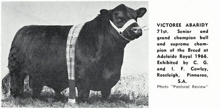 Between 1960 and 1969, the Cowley family had exhibited 23 champions and 3 supremes, as well as 31 firsts, 23 seconds and 15 third prizes winners at the Adelaide, Melbourne and Sydney Royal Shows. Their sire Victoree Erwin 77th was awarded top Angus sire in South Australia in 1964, 1965, 1966 and 1968, with a second place in 1967, and had progeny to go on to take out Champion and Supreme Champion at Adelaide and Sydney Royal Shows.