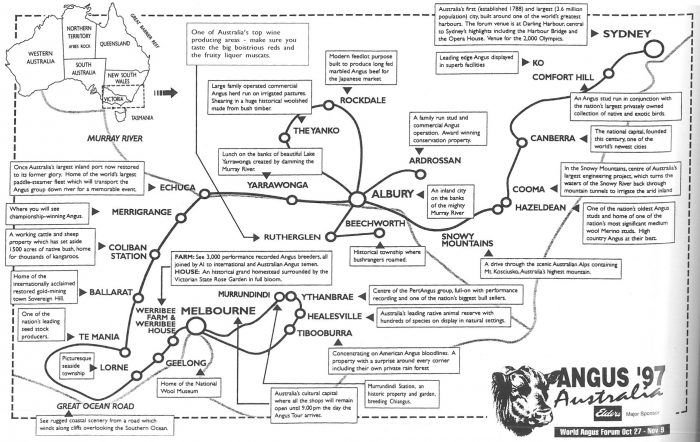 1997 saw the return of the World Angus Forum to Australian shores. The focus for the technical sessions was on the latest developments at the time in genetic improvement through performance and progeny testing, the production and marketing of branded products, the power of strategic alliances, cross breeding for profitability, the identification and selection of carcase traits, international genetic evaluation, marketing and merchandising seed stock and optimising management and nutrition to ensure profitability. Tours were also included prior to and post the forum, as well as a youth incentive for people 25 and under.