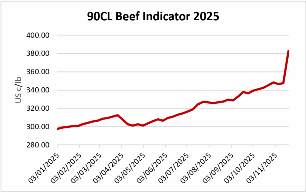 Much like a kangaroo on a trampoline, the 90CL price indicator has reached new heights in 2025, breaking and re-breaking record prices. 90CL stands for 90% Chemical Lean and is the main beef price used as an indicator of beef entering the US. This indicator has peaked near 300 US c/lb in 2014, 2019 and 2022, however this year it has left those peaks in the dust, exceeding 380 c/lb.