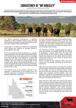 Situated in Central Queensland’s sandstone Brigalow belt, David and Chris Benn own and operate “Mt Kingsley”, where they run a certified organic, predominantly Angus herd. The Benn’s operation encompasses a breeding enterprise of 450 breeding females and a finishing enterprise where progeny are pasture finished to meet the organic export market specifications.