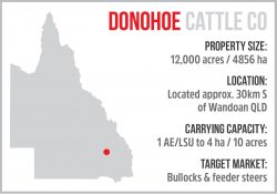 Originally running a predominantly Droughtmaster breeding herd, the Donohoe Cattle Company have been consistently introducing Angus genetics through bull purchases and more recently through purchasing lines of straight bred Angus females from southern New South Wales and Victoria. The Donohoe’s aim is to have a purebred Angus herd as they are seeking to maximise the ‘Angus premium’ as well as exploring new markets, such as the possibility of exporting beef direct to China.