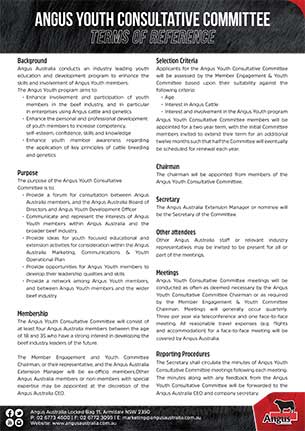 The consultative committee provides a mechanism to obtain structured feedback of ideas and suggestions from members and assist the Angus Australia Board of Directors and management in developing strategies and policies that ensure Angus Australia’s Youth program meets the current and future requirements of members.