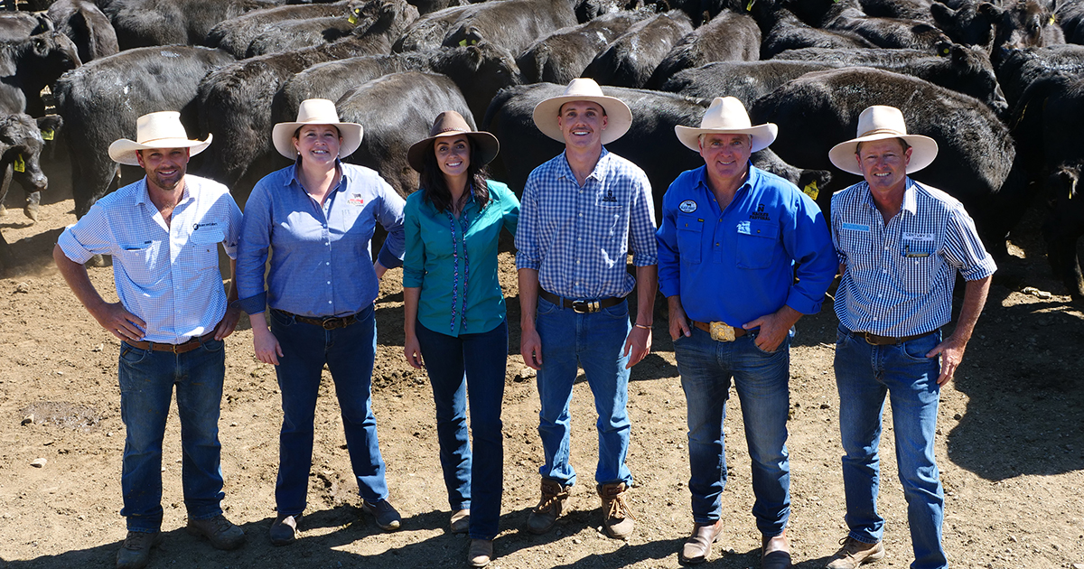 Feature Image: ‘First Angus Verified steers sold top the market at $1,950/head for 356 kg avg. L – R Rodney McDonald – Bowe & Lidbury Agents, Liz Pearson – Angus Australia, Alexandra Lynch, Jack Mackenzie and Robert Mackenzie – Macka’s Pastoral, Chris Paterson – Chris Paterson Stock & Station Agencies’.