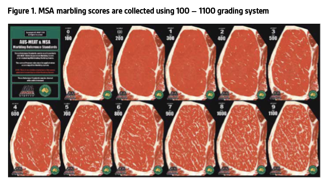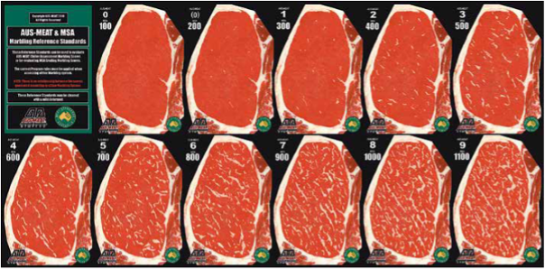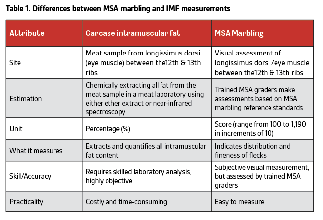 Both MSA marbling and IMF are assessed from the longissimus dorsi (eye) muscle between the 12th and 13th ribs. MSA marbling is assessed visually on chilled carcases, whereas IMF% is determined via chemical extraction of all fat from a muscle sample. While MSA marbling provides a subjective visual score (Figure 1), IMF% offers an objective quantification of intramuscular fat content. See further differences between carcase MSA marbling and IMF measurements in Table 1.