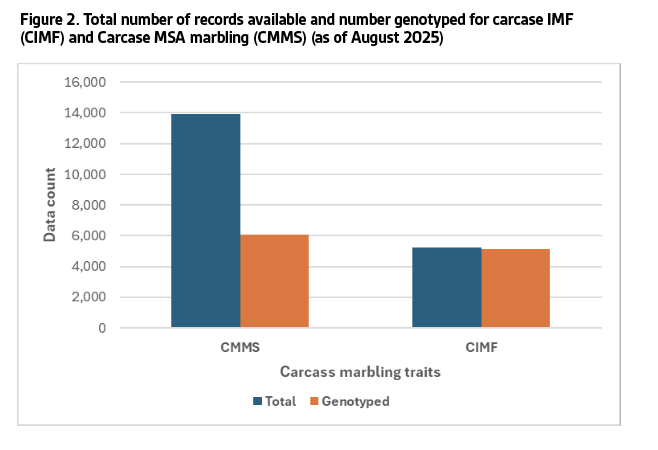 The Angus Australia dataset contains over 13,000 MSA marbling records, with around 44% also genotyped. For carcase IMF, there are more than 5,000 records, of which almost all (98%) are genotyped (Figure 2). The systematic recording of MSA marbling and carcase IMF traits over the years (Figure 3), supported by pedigree and phenotypic data collection from Angus Australia members and the Angus Sire Benchmarking Program (ASBP), underpins genetic evaluation aimed at improving eating quality.