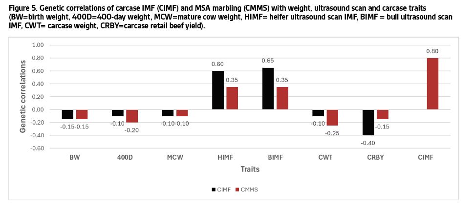The study by AGBU also estimated the genetic correlations between MSA marbling score and wide range of production traits included in the multi-trait analysis model utilized in TACE (from the BREEDPLAN program) (Figures 5). As expected, MSA marbling and carcase IMF show their strongest positive genetic correlations with bull ultrasound scan IMF and heifer ultrasound scan IMF. Even though, EBVs for ultrasound scan IMF traits are not reported, they contribute to the carcase IMF EBV and MSA marbling RBV through genetic correlations in the multi-trait BREEDPLAN model, thereby improving accuracy.