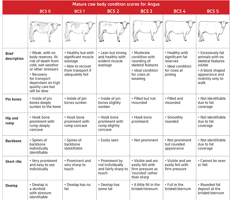 In an ideal Angus beef herd, where the cows have raised a calf to 200 days prior to weaning, it would be expected that the majority of animals would have a score of 2, 2.5 or 3, with a small percentage of animals receiving scores above 3. Weaning is typically the time of lowest condition score in the production cycle of the cow.