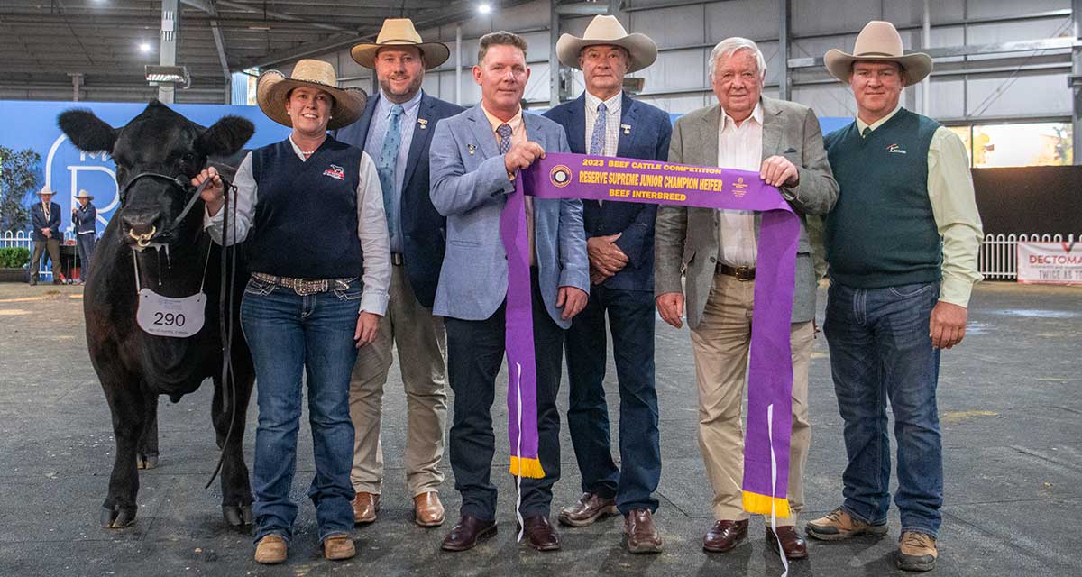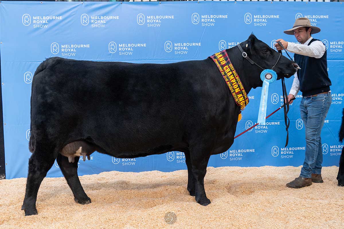 In the Angus ring, a four year old cow with twin bull calves Merridale Clydie Q24, exhibited by Merridale Angus took out the penultimate prize in the Angus ring, being sashed as the Supreme Champion Angus Exhibit after earlier winning Senior and Grand Champion Angus Female.