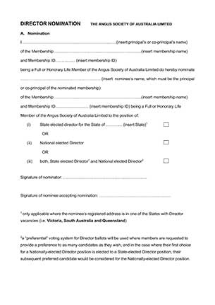 Nominations for either State elected Director positions or the National elected Director position, or both, can be made on the attached Director Nomination Form. Section A of the form must be completed and signed by both the nominator and the nominee (self-nomination is acceptable). Section B, the consent to act as a director, must also be signed by the nominee. An Election Statement (Section C) up to 300 words addressing the specified headings may also be provided by the nominee for circulation to members if an election is required (an electronic version of this template is available from the Angus Australia office).