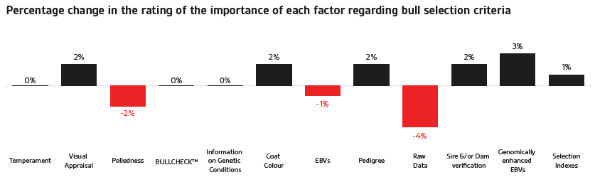 There has been limited change in how producers rate the importance of bull selection criteria. Most notably, there has been a reduction in the use of raw data, which doe does not allow for accurate comparison of genetics, due to not eliminating the environmental influences on an animal’s performance. In contrast, an increase was observed in the use of genomically enhanced EBVs, which provide producers with the ability to make more informed selection decisions.