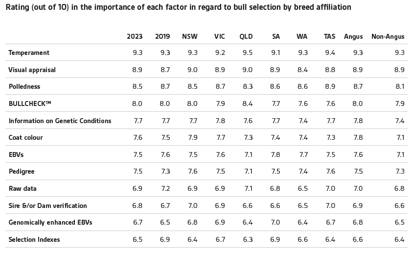 The surveys revealed that temperament continues to be the most significant trait in bull selection, maintaining its importance over the past five years.