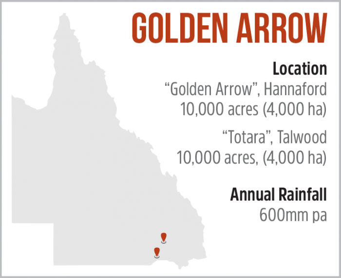 Fertility is a key focus at Golden Arrow, with PTIC rates consistently between 94 and 96%. Joining is a three-month window from December 1st, and any female that returns empty at preg-testing is culled. Maiden heifers are first joined at 15 months of age – either to leased Wagyu bulls, with all F1 progeny supplied to a local feedlot operator as weaners, or to calving ease focussed Angus bulls.