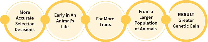 Broadly, by comparison to traditional selection methods, genomic selection facilitates more accurate selection decisions, earlier in an animal’s life, and for additional traits and animals.
