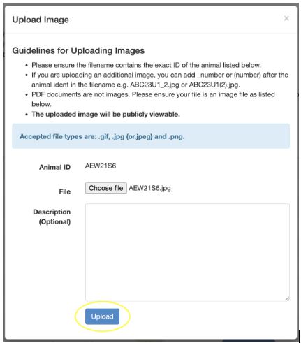Find the photo you wish to upload, select it and click ‘Open’. Make sure the image name is the animals FULL ident otherwise