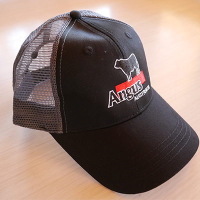 Black cotton twill cap with grey nylon mesh. Pre-curbed peak, embroidered eyelets, padded cotton sweatband, velcro touch fastener.